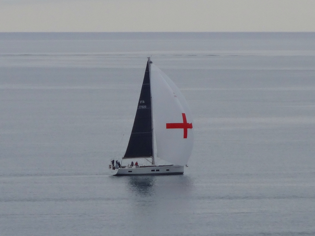 Questa barca con randa nera e Spinnaker bianco con croce di San Giorgio, se non ho letto male, si chiama Frally. Secondo il revisionismo molto di moda in corso, la croce di questo simbolo rappresenta il male dell’occidente, prima con le crociate, guerre di invasione e sterminio, e poi con Colombo, simbolo dell’imperialismo occidentale e della oppressione dei popoli autoctoni delle americhe.