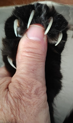 Questo è il pollice di un amico e la zampa del suo gatto, Gas. Mi scrive che il felino non stava ringhiando ma faceva le fusa, ossia è invecchiato e si è ammansito.