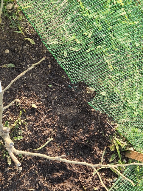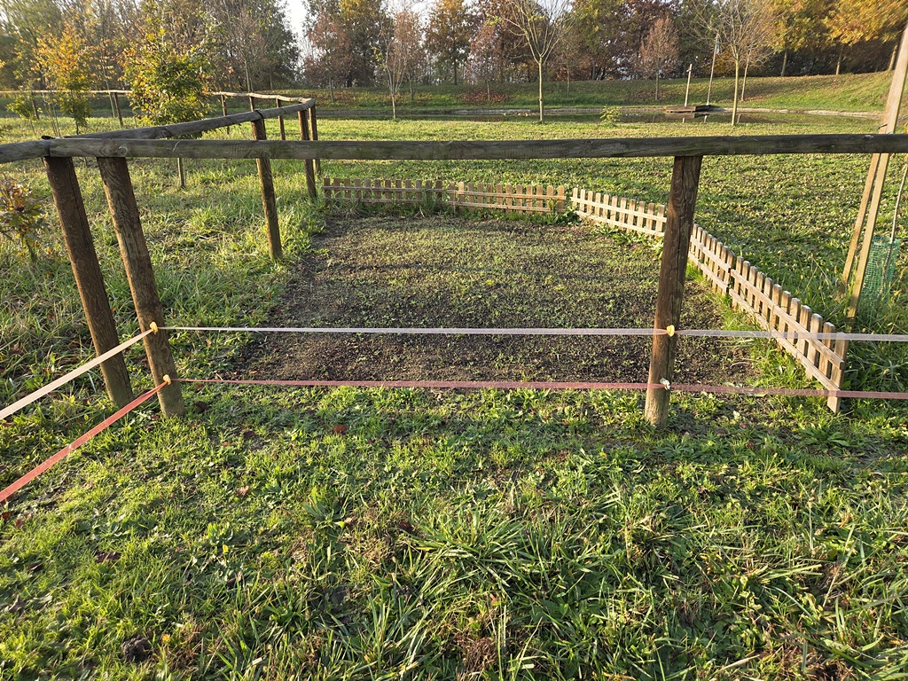 Questo è il recinto dell’Ontano. Un animaletto ha praticato un foro nella rete di plastica e si è introdotto all’interno. Non sembra aver fatto danni alla piantina, ci sono le sue impronte sulla terra soffice ma la pianta è intatta e non ci sono scavi. Allora cosa è andato a fare? Rompermi i coglioni. Instillarmi paure ed ansie, mandarmi un segnale del tipo “posso andare dove tu non vuoi e crearti dei dispiaceri”. Dovrei mettere una rete di fibra di carbonio elettrificata? Durante il mio soggiorno giornaliero del mercoledì non ho avuto tempo, ma ho una rete alta 25 cm di ferro che potrei aggiungere, ci devo pensare.