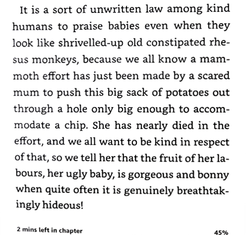È una sorta di legge non scritta tra gli esseri umani gentili elogiare i bambini anche quando sembrano vecchi macachi stitici e raggrinziti, perché sappiamo tutti che una mamma spaventata ha appena fatto uno sforzo da mammut per spingere fuori un grosso sacco di patate da un buco grande a malapena quanto una patatina. È quasi morta nello sforzo, e tutti noi vogliamo essere gentili nei suoi confronti, quindi le diciamo che il frutto del suo lavoro, il suo brutto bambino, è splendido e grazioso, quando molto spesso è davvero orribile da togliere il fiato!