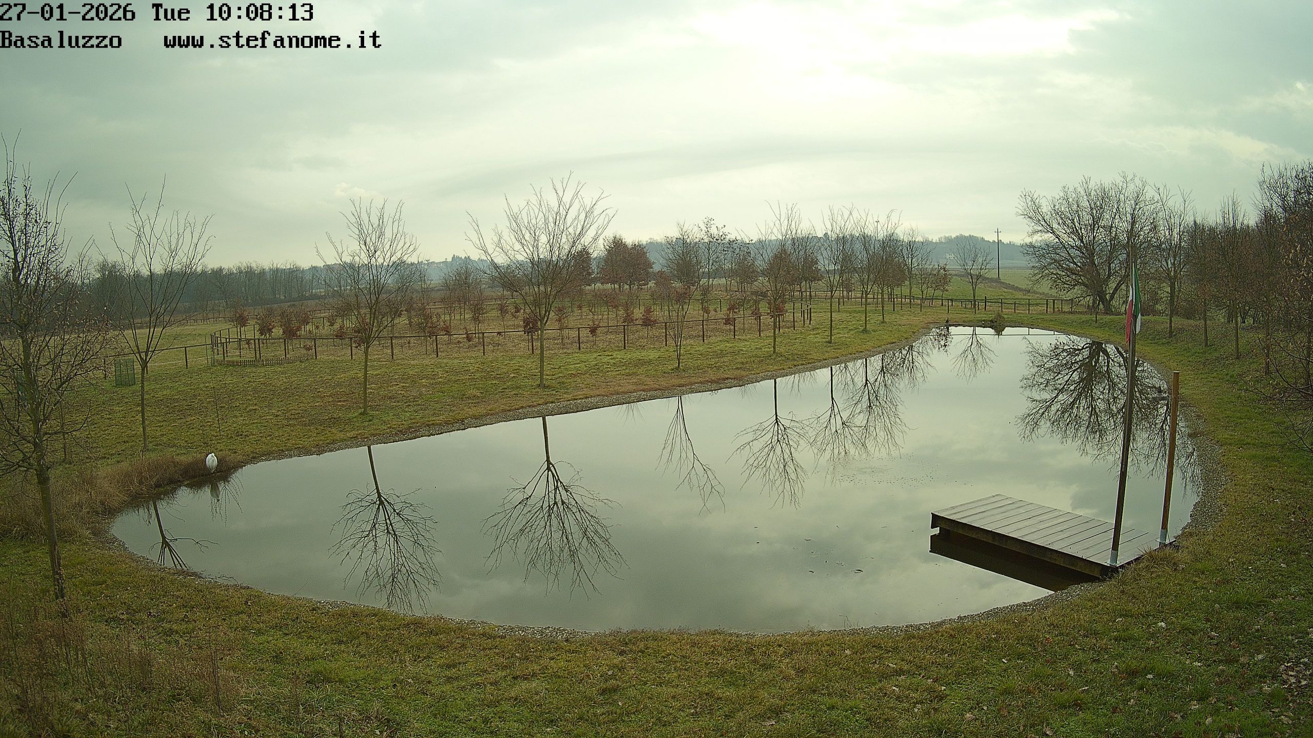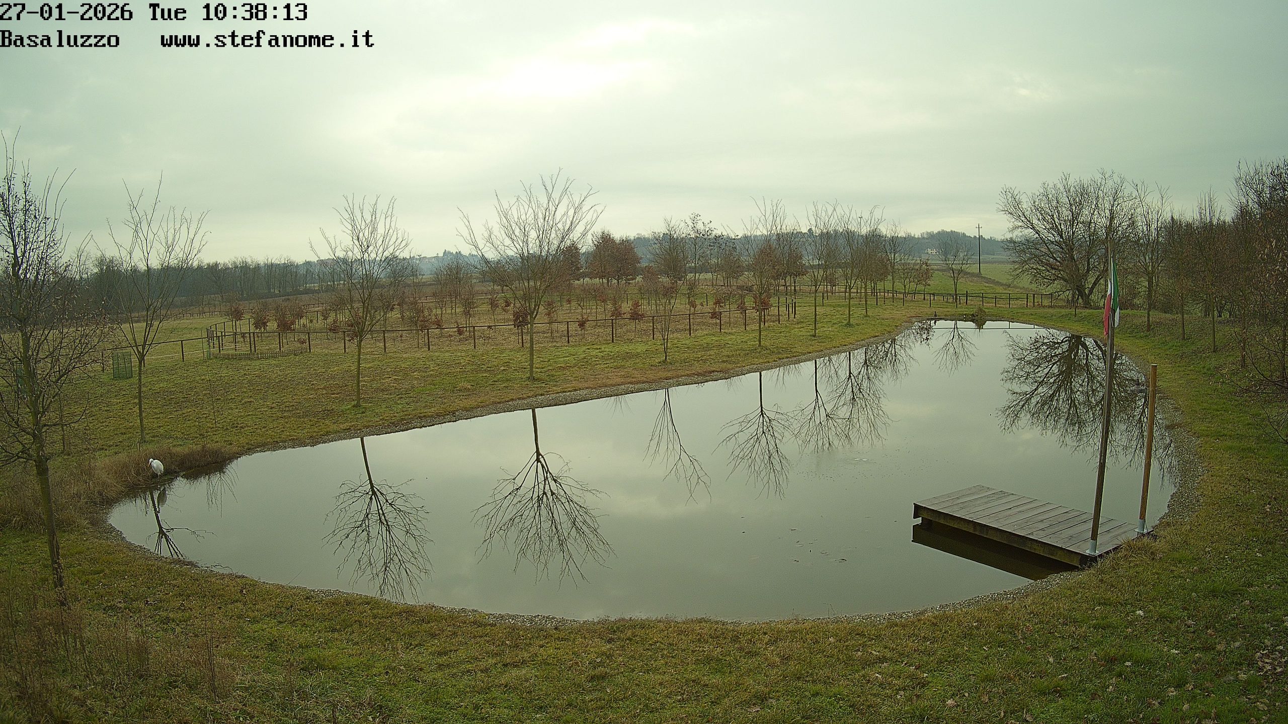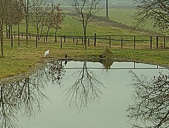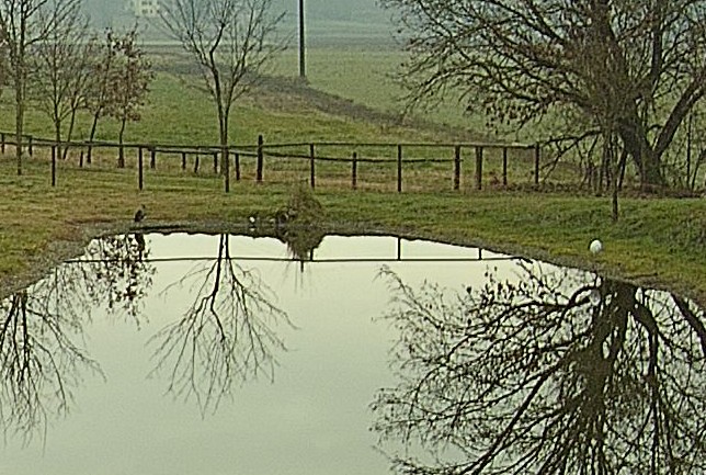 Il livello della Pozzanghera è salito e forse un po’ di acqua sta uscendo dal troppo-pieno. Nella foto si intravede il cugino bianco di Gastone con le zampe nell’acqua. Quando è così credo stia proprio pescando.