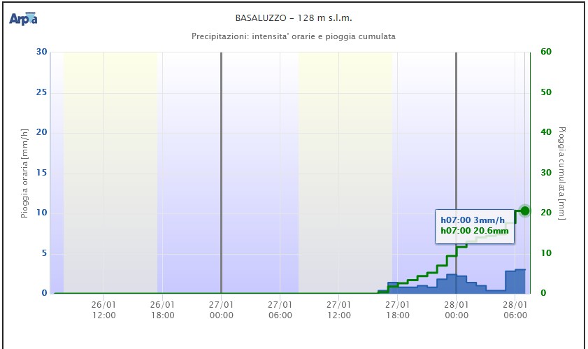 La neve prevista dal modello non è arrivata, anche il cosidetto nowcasting, che è un neologismo abbastanza cretino secondo me, pensa che stia nevicando, ma la neve è arrivata e sta arrivando unicamente sotto forma di 20 mm di pioggia, che è sempre la benvenuta.