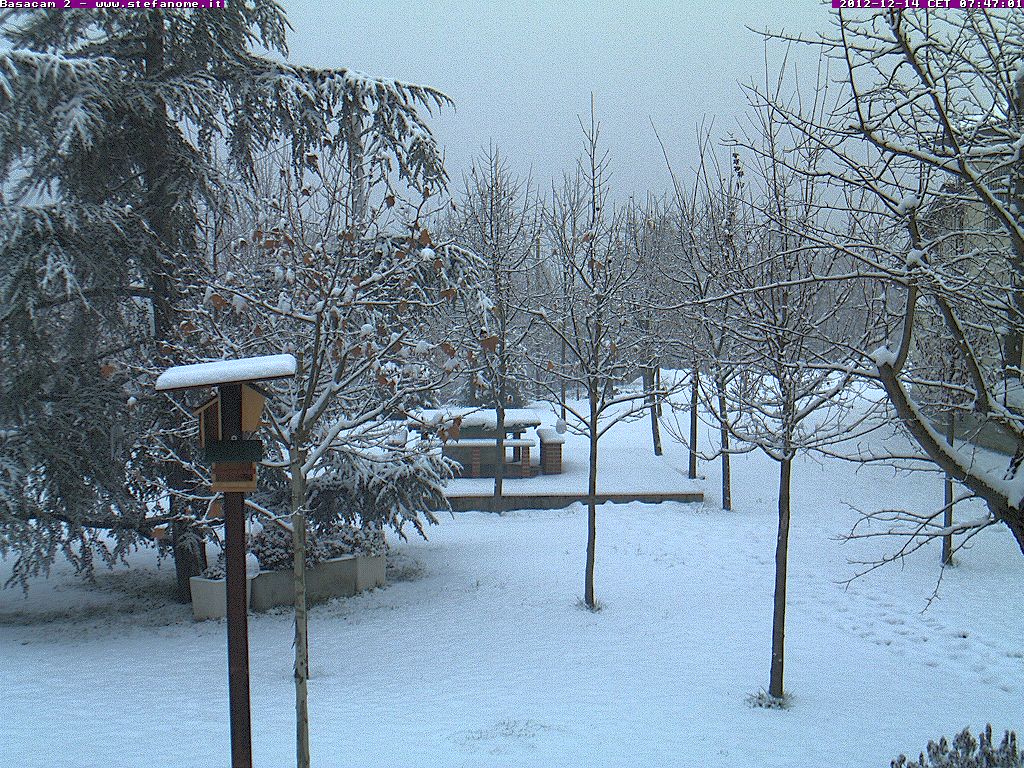 Il cortile di Basaluzzo in queste ore. Il tetto per gli uccellini funziona.