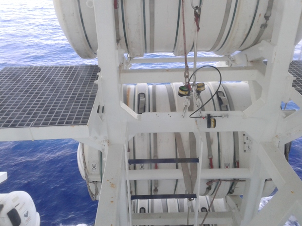 Queste sono scialuppe di salvataggio del traghetto. Queste sembrano in condizione di servire a qualcosa, ma per molte altre scommetterei che in caso di emergenza, rimarrebbero immobili, inchiodate ai propri supporti perchè i meccanismi di sganciamento sono totalmente arrugginiti e/o coperti da più strati di vernice. La vernice è stata probabilmente applicata con scrupolo da personale dotato di un titolo di studio pari alla patente per giocare a biglie.