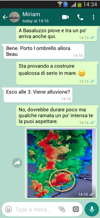 Con Miriam basta poco, ovvero annunciare un temporale quando lei è in giro per Genova. Il temporale diventa subito alluvione ed un fulmine sta per colpire casa nostra, distruggere l’impianto di allarme, tutti gli elettrodomestici incluso il mio rasoio, aprire le finestre ed allagarci. Lei non condivide la mia eccitazione di quando sta per arrivare un temporale. Stiamo parlando di un classico temporale estivo che al più può far cadere qualche rametto e che di solito dura i canonici 15 minuti, ossia la dimensione media di una cellula temporalesca e la velocità media con la quale si sposta interpolata eventualmente con il collasso della colonna ed il suo dissolvimento.