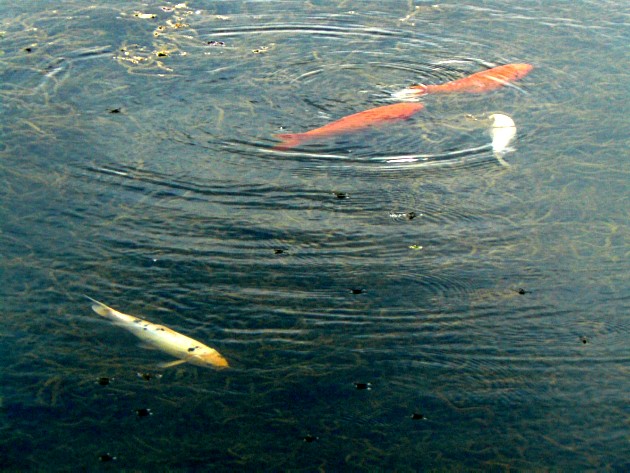 Le quattro Carpe riunite. Oggi una bianca era di nuovo scomparsa, si nasconde tra le piante, devo studiare meglio il comportamento dei pesci perchè anch’io starei nel verde tutto il giorno ma prima o poi devo uscire per mangiare qualcosa.
