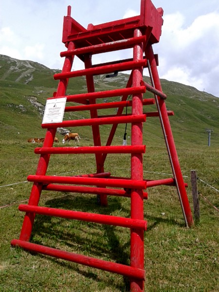 A circa 2400 metri di quota sopra Sant. Moritz, c’è un rifugio bar ristorante il cui gestore intraprendente ha installato alcune torrette di osservazione come questa. Come dice il cartello, manlevando l’intera popolazione umana da qualsivoglia responsabilità, a proprio rischio & pericolo, ci si arrampica e poi ci si siede fermamente incastrando le chiappe su quel pomolo che assicura una buona tenuta anche nel caso in cui una mucca xenofoba attacchi la struttura. Potrebbe essere il blueprint di una analoga costruzione sulla collinetta che sovrasta la Pozzanghera, senza il piolo, sulla quale posso osservare in silenziosa rassegnazione le crepe nel fango che si allargano con il procedere della siccità.