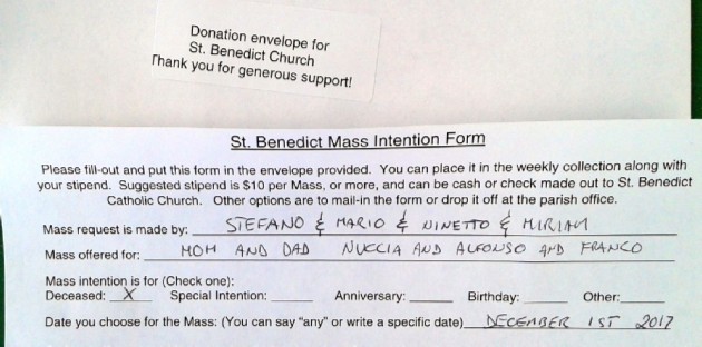 E poi c’era questo. Pur vivendo immerso nel mio agnosticismo, talvolta vengo preso da dei raptus che mi portano a fare cose di tipo religioso, sentimentale, mistico. Ho anche dato l’indirizzo al quale dovrebbero spedire una cartolina dopo che la messa di suffragio è stata recitata. Staremo a vedere. Ho incluso anche il papà di Miriam, in teoria risparmiando ben $10. Ma ho comunque lasciato $20, sperando che la preghiera venga detta ad alta voce.