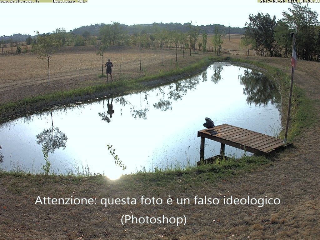 Roberto qualche giorno fa mi ha gentilmente mandato due foto della Pozzanghera. Nella prima ci sono io che, ricordo, stavo cercando di fotografare le Carpe, nella seconda c’è Gastone che si sta probabilmente grattando sotto un’ala con la testa piegata e sembra decapitato. Allora ne ho composta una dove ci sono io che sembro nell’atto di fotografare Gastone decapitato. Photoshop.