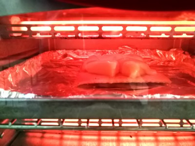 Dei pezzetti di toma su un crostino di focaccia sotto la griglia.