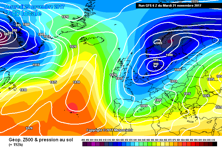 Se la mappa a 288 ore (12 giorni) valeva come se fosse stata disegnata da uno scimpanzee con un pennello in mano, questa a 192 ore (8 giorni) è più o meno della stessa risma. In più non è l’evoluzione modellistica della precedente saccatura, ma una previsione totalmente nuova, ossia una saccatura ex novo che prima non c’era. Insomma un sogno modellistico che a ben vedere lascerebbe il Nord Ovest al freddo ma in ombra pluviometrica, insomma spero che cambi qualcosa e che piova, accidenti.