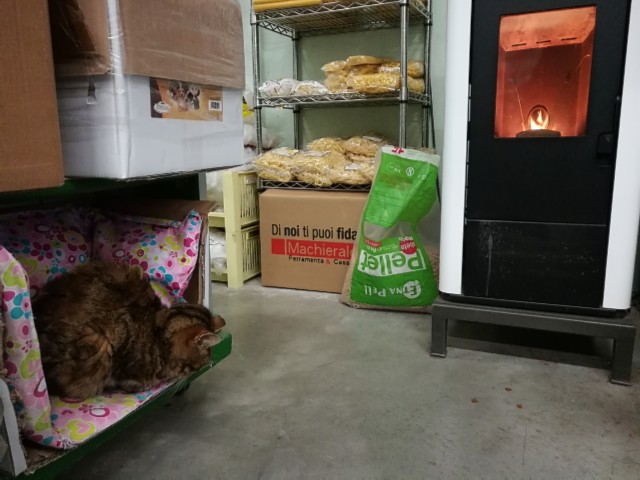 Anche il Consorzio Agrario ha assunto l’assetto invernale. Nel grosso capannone è impensabile che questa piccola stufa possa avere minimamente influenza sulla temperatura. Mi viene da pensare che la mettono per il gatto, il cui giaciglio è a meno di un metro. Il peloso sembra gradire.