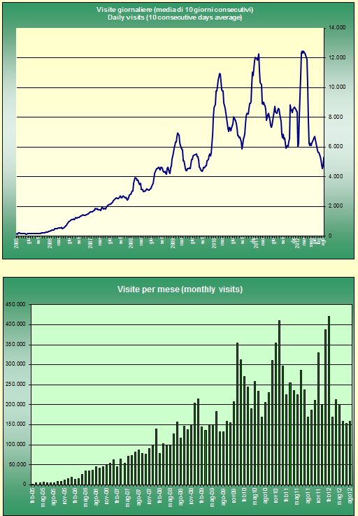 Visite totali dall’inizio trasmissioni, 12.966.161, su 2.752 giorni. Durante questi ultimi mesi estivi pochi i visitatori, salvo un picco a fine Agosto per qualche temporale.