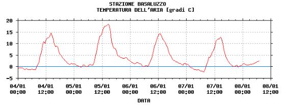 Questo grafico rappresenta la misurazione costante della temperatura a Basaluzzo rilevata da una stazione meteo gestita dall’ARPA piemontese da 4 al 7 Gennaio 2013. E’ normale che la mattina del 5 Gennaio il termometro segni 0°, ma è da assoluta fiction cinematografica che a mezzogiorno ne segni quasi 19.
