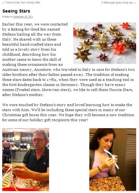I had an idea and got in touch with BFG sometime on January 2011, but had no answer. Next April I was again in NY so I contacted once more BFG, this time I delivered a paper star to them, offering to teach them the skill, and Emily replied. We met for the first time together with her business partners at a Starbuck on 2nd and 80 something in Manhattan. That’s how the story went after. And this is the abstact on Emily’s Blog: Seeing Stars.