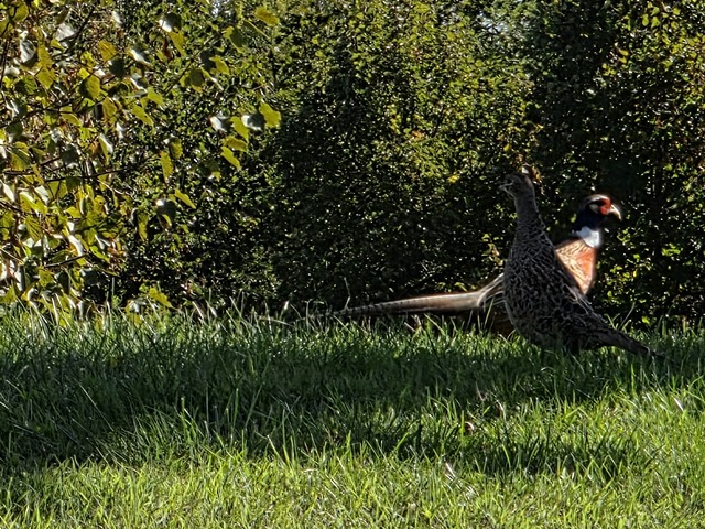 In questa foto orrenda a malapena si vedono due fagiani. Una coppia, per nulla spaventati della mia presenza, probabilmente sono quelli allevati e poi “lanciati” nelle selvagge campagne a beneficio di cacciatori ipovedenti.