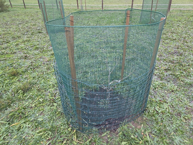 Riparazione di urgenza, il piccolo stronzetto potrebbe tornare, tre giri di rete di ferro. Gli altri 4 alberelli non sono stati toccati, si vede che il modello di pianta non piace. Oppure se li è tenuti per un’altra incursione. Tra questi ed i caprioli non c’è da meravigliarsi se i boschi fanno fatica a sopravvivere, i giovani muoiono sul nascere ed i vecchi muoiono senza le nuove generazioni.
