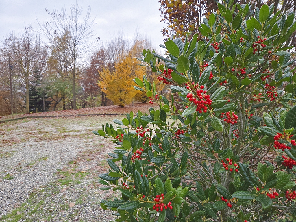 Mi consolo con queste bacche rosse ed un carpino giallo in secondo piano. Guardo i rami da potare con incelabile bramosia, è un momento catartico perchè i pochi interventi che faccio servono a migliorare la resistenza degli alberi adulti. Niente di invasivo, sono solo ritocchi di rami che si toccano troppo intensamente o che sono troppo bassi e non fanno passare l’aria. Mie idee campate per aria.