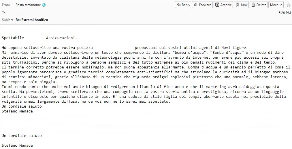 Eh no, cazzo. Nella mia nuova polizza di assicurazione viene usato il termine “bombe d’acqua”. Quando qualche giorno fa ho incontrato l’assicuratore che mi ha nominato le due parole ho strabuzzato gli occhi e poi gli ho fatto una filippica sull’uso improprio del termine. Allora ho preso carta e calamaio ed ho trasmesso la seguente missiva.