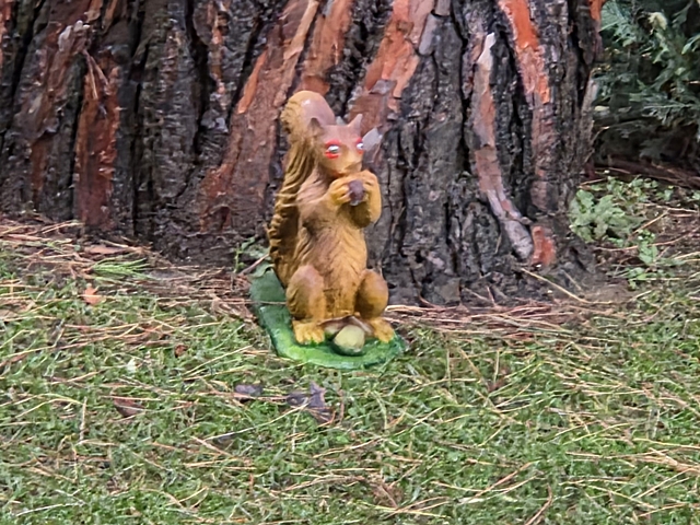 Mia suocera ha messo in giardino una statuetta. Credo abbia un significato emotivo, del tipo era di suo marito acquistata durante una gita in montagna o qualcosa del genere. Gli occhi dello scoiattolo però sono inquietanti. Sembra stia suonando un oboe e tra i piedi ha due cose verdi che sembrano qualcosa facente parte dei suoi organi genitali.