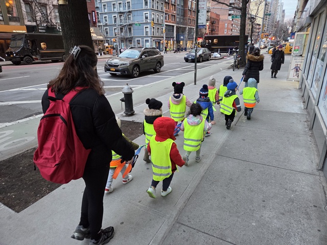 Corpetto antinfortuni ad alta visibilità, legati ad un guinzaglio. La capobranco adulta guida e poi un’altra adulta chiude la fila. Nello zaino c’è un teaser ed una pistola che spara tranquillante per i bambini che cercano di scappare.