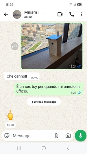 Ho mandato questa foto a Miriam. Immaginavo pensasse fosse un sex-toy per me ma con un foro troppo grande. Invece mi ha risposto che carino, e poi quando le ho suggerito un uso alternativo, s’è financo offesa.