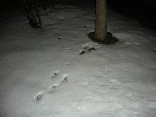 … è sopravissuto alla neve ed oggi è tornato. S’è fatto fare coccole da Miriam che poi è gonfiata come un dirigibile per l’allergia, non ha disdegnato un po’ di croccantini e un po’ di scene sulla neve. L’ho già visto diverse volte correre verso uno dei Liquidambar, saltarci sopra per farsi le unghie. Stavolta ha lasciato le sue tracce.