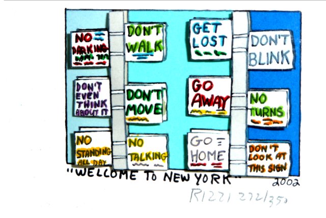 Mi sono comprato questo minuscolo quadretto in 3D. E’ di un neworkese che ironizza sui numerosi divieti che ci sono lungo le strade cittadine, sottendendo che in realtà ci si vive benissimo perchè chi vive a New York è dotato di ironia, sopportazione, tolleranza per il solo fatto di abitare nella citta ” che vive sull’orlo del disastro”. Cool (pron. cùl) ma anche mainstream. Slightly Vacaghèr sulle ortiche.