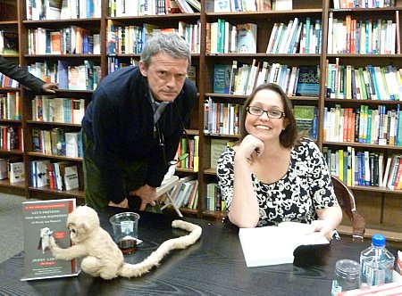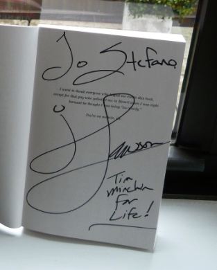 Al secondo piano della libreria, in un angolo, c’è un podio ed un centinaio di sedie. Arriviamo un po’ in anticipo; ci sono almeno 8 addetti della libreria ed un poliziotto che presidiano il posto. Ai lati ci sono due grossi scaffali per l’esposizione dei libri rigorosamente divisi per argomento. Curiosamente si fronteggiano “Sex & Love” da una parte e “Religion” dall’altra. Alle 7, le cento sedie sono tutte occupate da una moltitudine di persone molto eterogenea. Grande maggioranza di donne, dai 20 ai 60 anni di età, pochi i maschetti, una quindicina al più. Vengono raccolte le richieste di chi vuole farsi autografare il libro. Una signora mi chiede il nome ” Stèfano, S-T-E-F-A-N-O” dico io. “Ah, Stefàno” dice sicura la signora, mettendo come di consueto l’accento sulla A, perchè per gli anglosassoni non è concepibile che l’accento sia sulla E. “Whatever” rispondo rassegnato, la signora scrive il mio nome su un post-it e lo mette nella seconda pagina del libro, prima di restituirmelo. Finita la converenza, gli addetti annunciano che le persone sedute nella prima fila di sedie si possono alzare e mettersi in coda per la firma. Quando la persona arriva al tavolo, consegna il libro con il post-it alla signora che lo appoggia sul tavolo dove Jenny è pronta a prenderlo e firmarlo, segue la foto di rito, a cura di una ragazza che prende in consegna il cellulare o macchina fotografica del fan e scatta la foto per poi restituire al fan il suo mezzo elettronico. Una voce aveva pregato ai presenti di consegnare alla ragazza il telefono “switched on and ready to take a picture” per non perdere tempo. Era la mia prima serata di questo tipo.