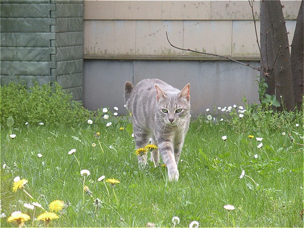 … miagola disperato, si struscia nelle gambe, si rovescia per terra mostando la pancia, si alza sulle sole zampe posteriori per sfregarti il muso quando ti abbassi per toccarlo. Allora gli dai da mangiare, poi gli scoppia la mattana e corre avanti e indietro per il cortile per qualche minuto, infine si ferma a riposare e poco qualche minuto sparisce.