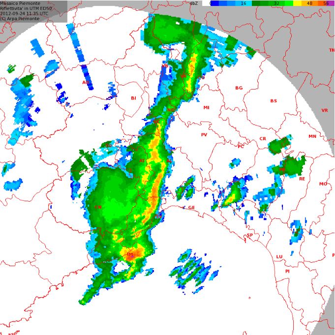 Ecco un fermo immagine da radar; un breve ma intenso fronte piovoso in rapido movimento da ovest verso est, come da manuale.