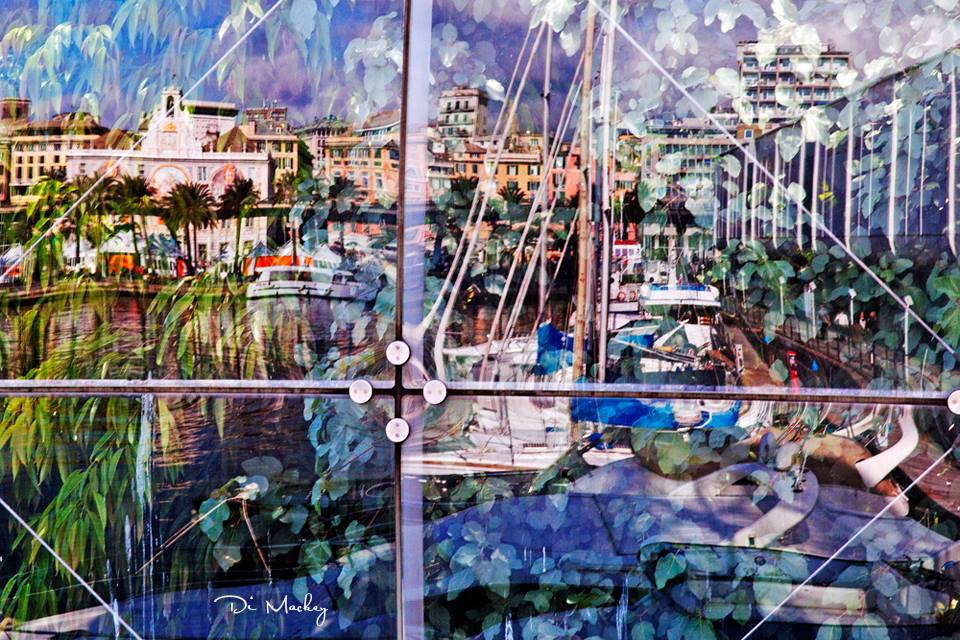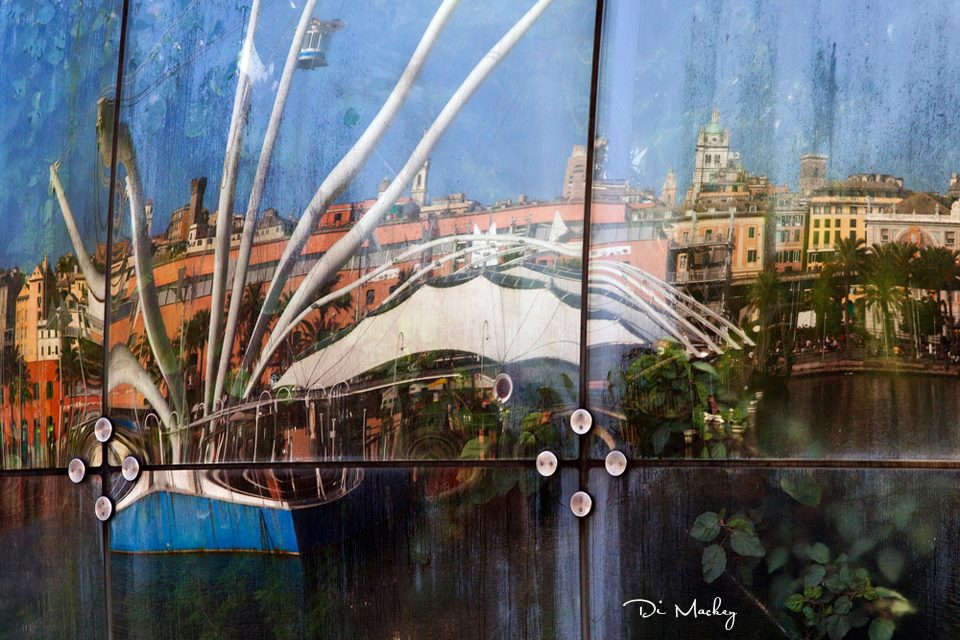 Ci ho messo un po’ a capirlo, non conoscendo l’artista e le sue tematiche, ma poi ne sono venuto a capo: sono le immagini del porto antico riflesse sui vetri della biosfera di Renzo Piano. Sono effettivamente bellissime, reinterpretate con fine e sensibile tocco d’artista, emozionanti e molto più colorate rispetto ai freddi riflessi dei vetri….e quì mi fermo, per non essere asfaltato dai giudizi dei soloni critici d’arte. Belle comunque, ed i significati reconditi ognuno se li cerchi dove vuole, dal conflitto genitoriale, al mal di vivere quotidiano, alla sensualità repressa ed anche vagamente omosessuale, all’influenza di filosofie trascendentali….. A parte le cazzate che possono sparare i vari critici d’arte, restano delle belle immagini godibili, simili a dei trompe l’oeil che ti fanno solo sentire bene per il solo piacere di guardarle, e tanto basta per farti dire: belle, brava!