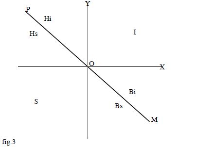 La formulazione della legge e del suo corollario è ancora del tipo «micro». Come sopra indicato, tuttavia, la legge ed il suo corollario hanno profonde implicazioni di natura «macro». Il punto essenziale da tener presente è questo: il risultato dell’azione di un perfetto bandito (la persona che cade sulla linea OM della fig. 2) rappresenta puramente e semplicemente un trasferimento di ricchezza e/o di benessere. Dopo l’azione di un perfetto bandito, questi avrà un «più» sul suo conto, «più» che equivarrà esattamente al «meno» che egli ha causato ad un’altra persona. Per la società nel suo insieme la situazione non è migliorata né peggiorata. Se tutti i membri di una società fossero dei banditi perfetti, la società rimarrebbe in condizioni stagnanti, ma non ci sarebbero grandi disastri. Tutto si limiterebbe a massicci trasferimenti di ricchezza e benessere in favore di quelli che compiono l’azione. Se tutti i membri della società dovessero compiere l’azione a turni regolari, non solo l’intera società, ma anche i singoli individui, si troverebbero in uno stato di perfetta stabilità. Ma quando gli stupidi si mettono all’opera, la musica cambia completamente. Le persone stupide causano perdite ad altre persone senza realizzare dei vantaggi per se stessi. Ne consegue che la società intera si impoverisce. Il sistema di computo espresso nei grafici base mostra che, mentre tutte le azioni di individui che cadono alla destra della linea POM (vedi fig. 3) incrementano il benessere di una società, sia pure in gradi diversi, le azioni di tutte le persone che cadono alla sinistra della stessa linea POM impoveriscono la società. In altre parole, gli sprovveduti dotati di elementi di intelligenza più elevati rispetto alla media della loro categoria (area Hl), come pure i banditi con doti di intelligenza (area Bi) e soprattutto gli intelligenti (area I) contribuiscono tutti, anche se in misura diversa, ad accrescere il benessere della società. D’altro canto i banditi con doti di stupidità (area Bs) e gli sprovveduti con elementi di stupidità (area Hs) non fanno altro che aggiungere perdite a quelle già causate dalle persone stupide, aumentando così il nefasto potere distruttivo di quest’ultime .