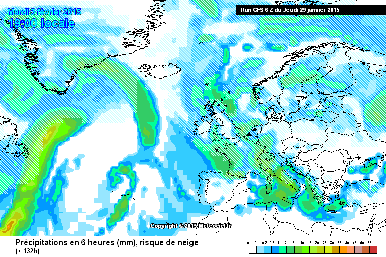 GFS rincara la dose. A -132 ore (ma ho considerato la mappa 6 ore in avanti, non l’una del pomeriggio ma le 7 di sera.). Interessante; comunque ancora troppo presto per prendere il sale, la situazione può ancora ribaltarsi. In un run intermedio, per esempio, il fronte sembrava prendere una strada più a sud, togliendo al NW italiano non solo la neve, ma anche buona parte delle precipitazioni.