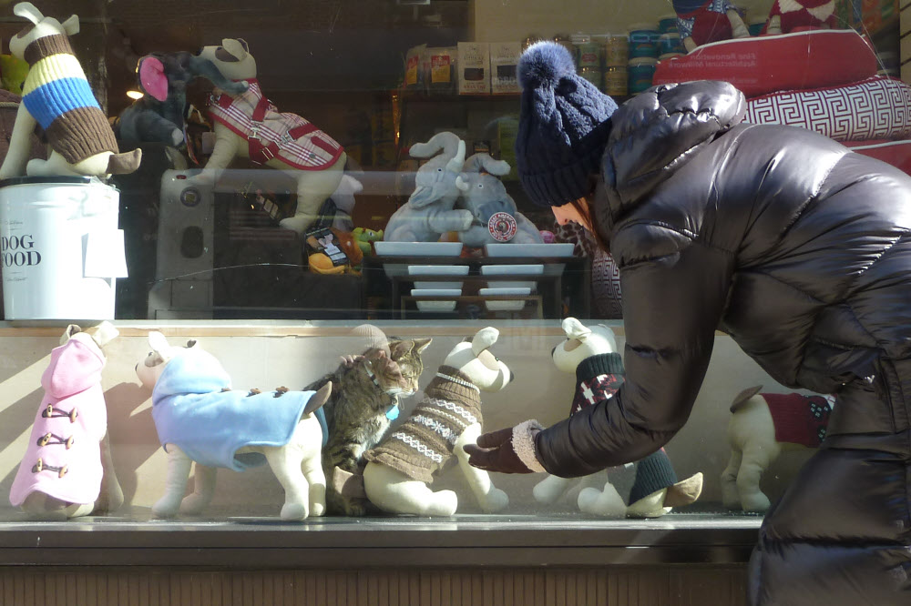 Scoprire l’intruso. Miriam o il gatto, oppure entrambi rispetto al negozio che vende accessori per cani. Miriam è in versione AMIU con il suo piumone per la raccolta indifferenziata.